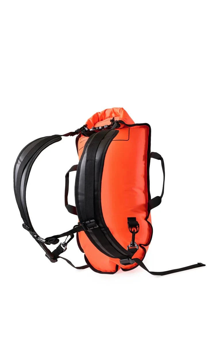 Binnen enkele seconden transformeert de rugzak in een high-performance zwemboei die soepel achter je aan drijft zonder je slag te hinderen.